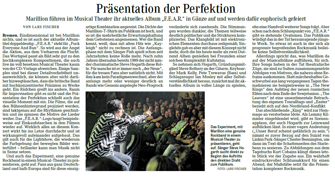 Kurz: Marillion im Theater – kann man mal machen, meint auch der Weser-Kurier und die Kreiszeitung.